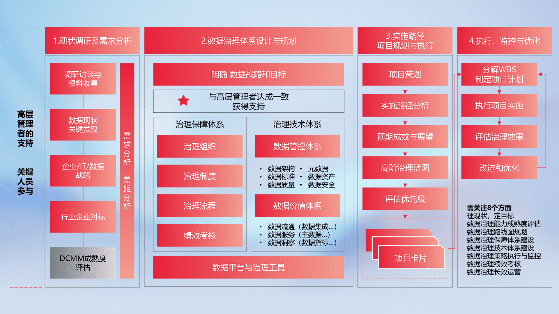 制定并执行统一的数据标准,,,,规范数据定义和格式,,,消除冗余和不一致性,,,,实现跨部门和跨系统的数据一致性,,,,为企业提供标准化的数据基础。。